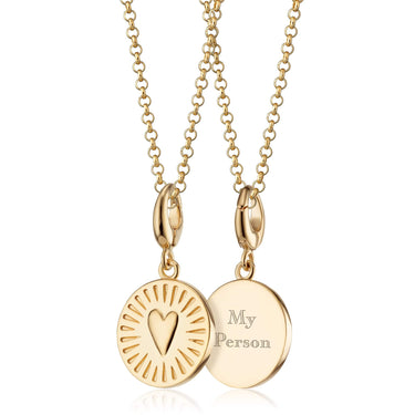 What is your love story! Tell yours with this gold love heart disc charm necklace. Featuring a stunning raised heart and line detailing on the front, this heart disc charm necklace is the perfect symbol of love, connection, and personal style. Customise this heart charm on the back with a special message, name, or date for a truly meaningful jewellery gift or form of self-expression. This stunning love heart disc charm necklace has a little heart with big meaning.