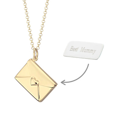 This stunning gold plated envelope necklace opens up like a real envelope to reveal a sterling silver card insert that can be engraved on both sides with your very own secret message. Crafted from sterling silver with 18ct gold plating this envelope pendant has been beautifully detailed and hand finished for a brilliant shine. Featuring a click to close fastening the gold envelope is sealed with a heart, and opens to uncover a removable sterling silver card insert – the perfect jewellery gift to treat someone you love!