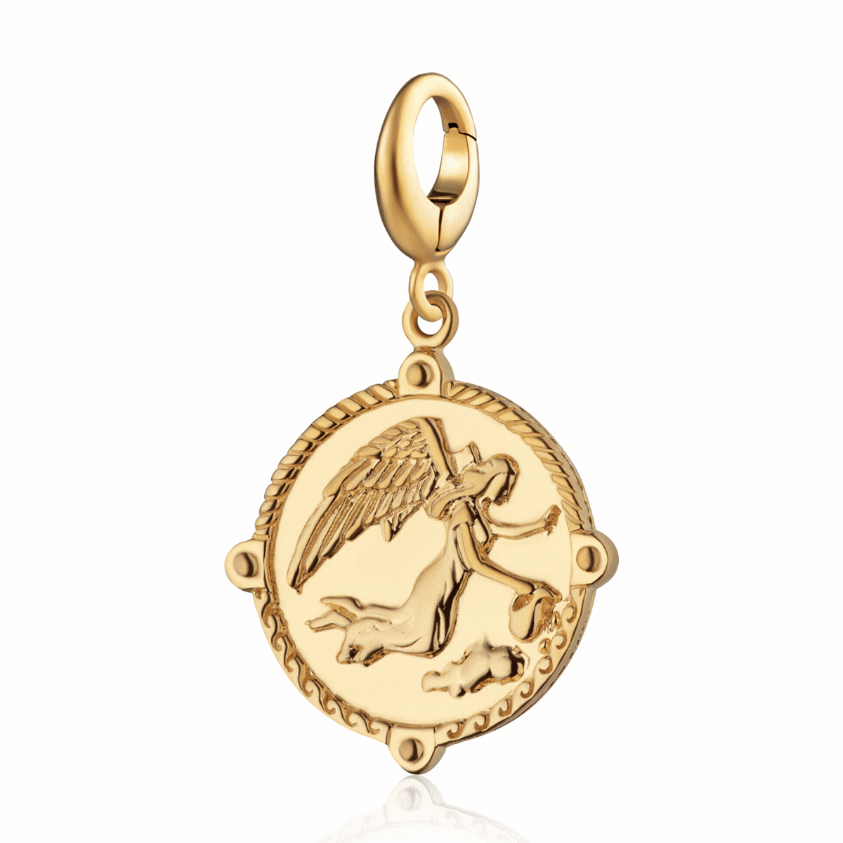 Nutzen Sie die Macht der Kommunikation mit unserem goldenen Iris-Anhänger, der Göttin der Kommunikation. Inspiriert von der griechischen Göttin des Regenbogens, Iris, der göttlichen Botin, fängt dieser atemberaubende Anhänger ihr Wesen perfekt ein. Die Vorderseite zeigt eine wunderschöne Darstellung von Iris mit Flügeln und ihrem Wasserkrug, während die Rückseite das Caduceus-Symbol zeigt. Dieser aus recyceltem Sterlingsilber gefertigte und mit 18 Karat Gold plattierte Göttinnen-Anhänger ist eine Hommage an Iris‘ Rolle bei der Förderung klarer Kommunikation und Verbindung.