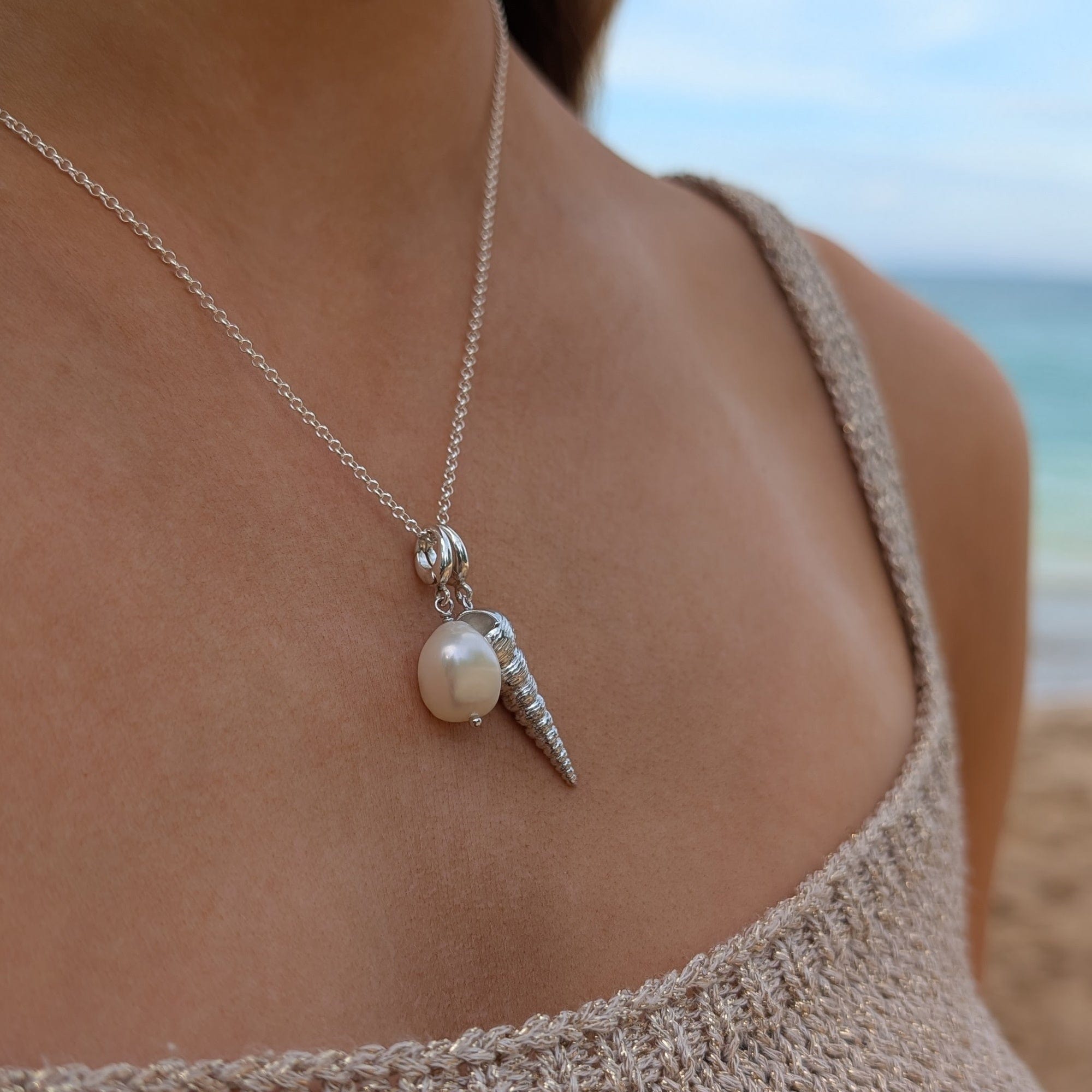 Diese Muschel-Halskette mit Turmanhänger ist ein atemberaubender, vom Strand inspirierter Charm, den Sie Ihrer Charm-Schmuckkollektion hinzufügen können. Eine elegante Muschel-Halskette mit Bohrer, die ideal ist, um Ihrem Outfit Strandstimmung zu verleihen. Dieser aus 925er Sterlingsilber gefertigte, vom Meer inspirierte Charm verfügt über eine elegante, lange Silhouette mit aufwendig detaillierten Spiralen für einen dreidimensionalen Muschel-Charm, der an Schmuckstücke erinnert, die man an einem tropischen Sandstrand findet!