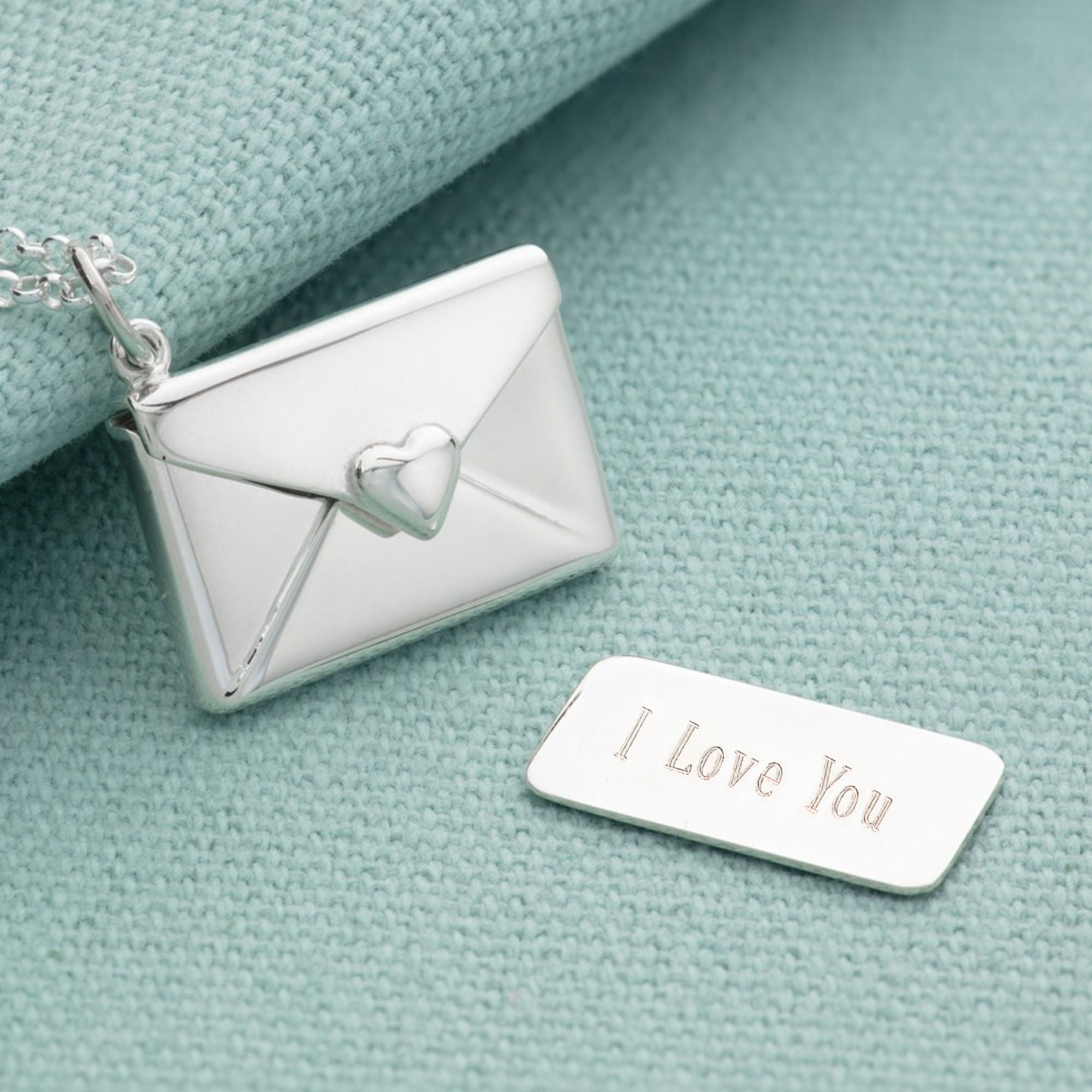 This silver envelope necklace opens to reveal a sterling silver letter insert pre-engraved with the message 'I Love You'