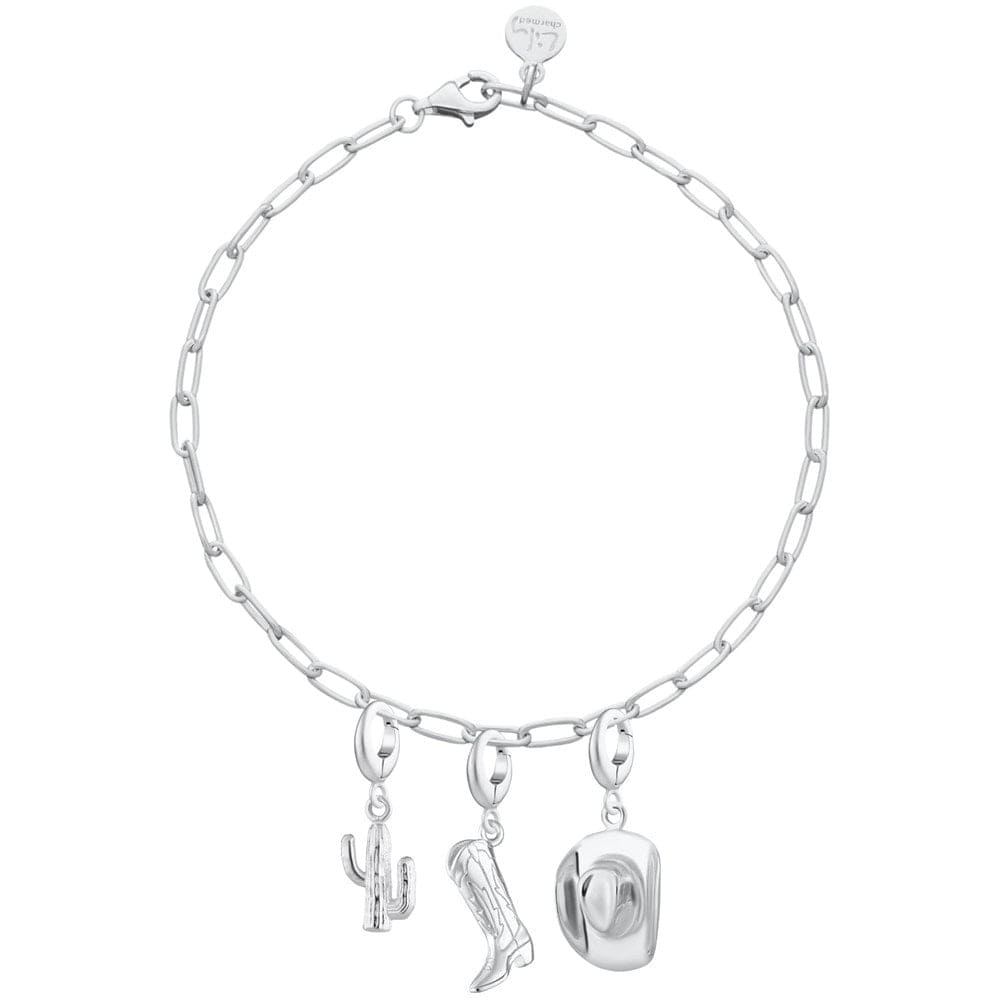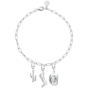 This charm bracelet captures the spirit of the wild west, with a cactus, a cowboy boot, and a cowboy hat charm
