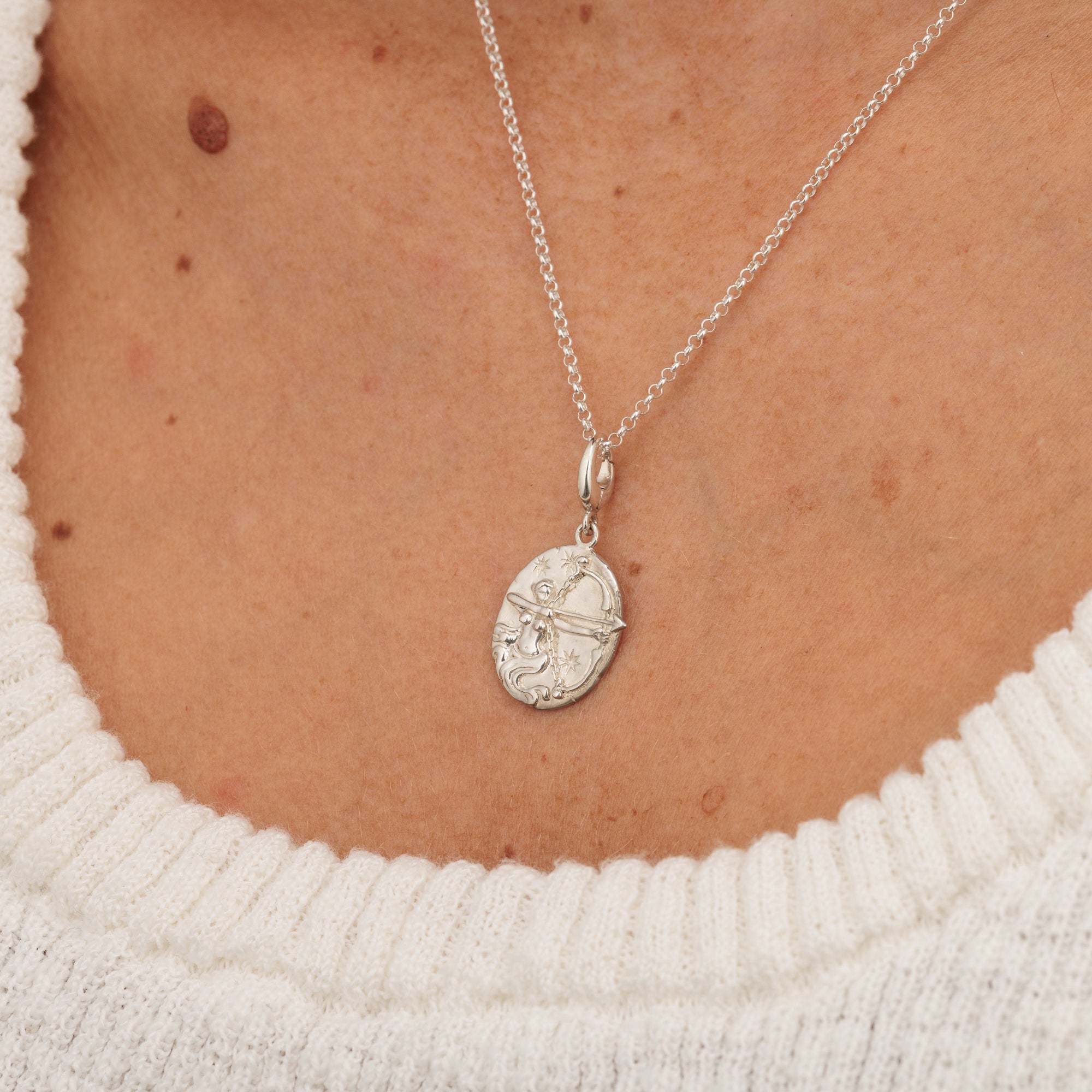 A stunning astronomy coin pendant crafted from 925 sterling silver and hand finished to give intricate detailing of a mythical goddess. Half woman she holds a bow made from a real chain, while her arrow is pointed ready to fire. A stunning celestial medallion this zodiac coin has been given a mottled edge to create a vintage roman feel, while the back is left flat to sit perfectly when worn. The archer symbolises optimism, adventure and independence.