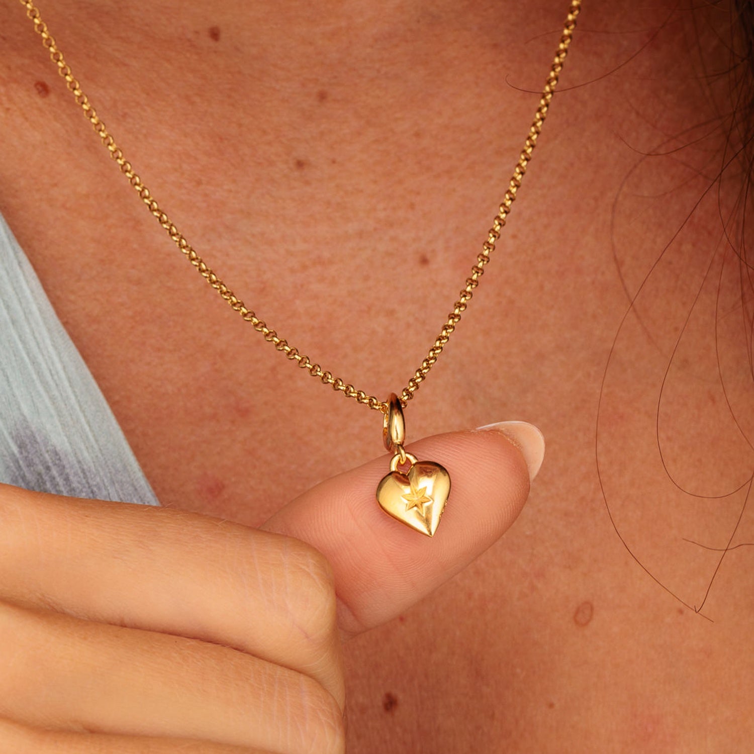 Discover direction and devotion in one elegant piece. This heart charm necklace features a delicate north star embossed at its centre on both sides, symbolising protection, guidance, and unconditional love. Handcrafted from 100% recycled 925 sterling silver with 18ct gold plating, it's designed for everyday elegance and meaningful layering. Wear it as a gentle reminder to trust your path and let love navigate your way forward. This heart pendant necklace also makes the perfect gift to celebrate Valentine's Day.