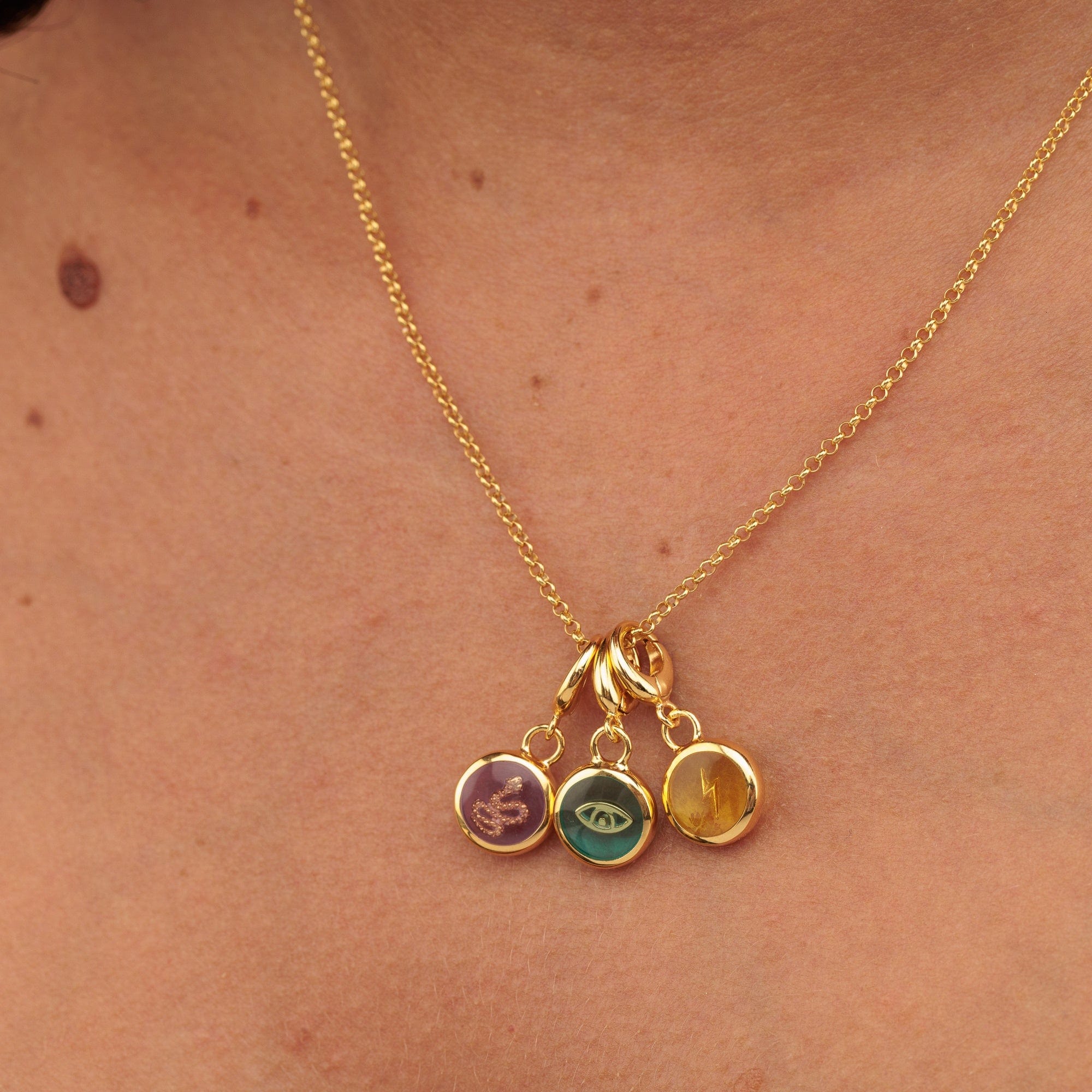 This purple resin capture charm has a secret to reveal! Hold the resin charm up to the light and you will see a detailed coiled golden snake charm encased in violet hues. Captured and preserved as if frozen in time, our resin disc charms are inspired by the natural characteristics of amber, where the sap from trees create a golden protective layer around plants and small animals. The snake is a symbol of both good and evil making this resin capture charm a compelling addition to your charm jewellery collection.