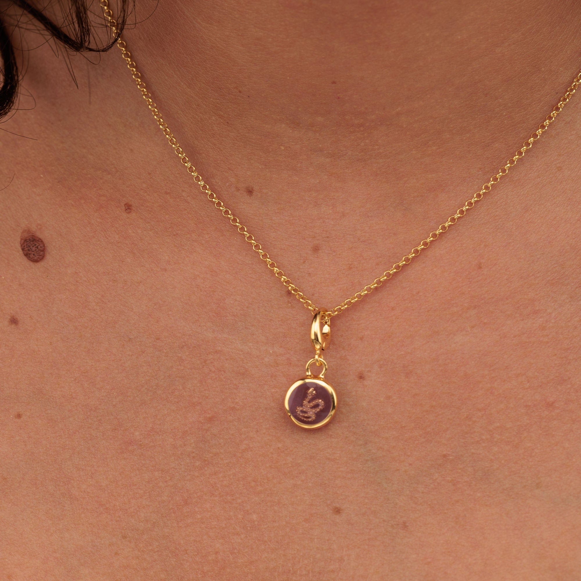 Hold this resin disc necklace up to the light to reveal a dainty golden coiled snake charm, encased in a myriad of captivating berry hues. An elegant representation of the natural beauty of amber, our designer was inspired by the way amber captures and protects small animals and plants in a golden layer as if frozen in time. Embodying the power of light and dark the serpent is often used as a symbol of good luck.