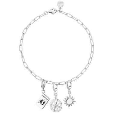 Elevate your holiday style with our silver holiday oval link charm bracelet. This stunning charm bracelet features elegant oval links with three holiday themed charms crafted in sterling silver. Perfect for starting off your travel & adventure inspired charm bracelet with a sunshine, compass and passport charm. Where will this travel charm bracelet take you?